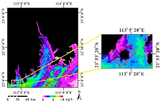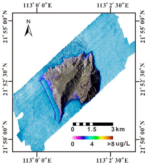 Although the CASI can provide subtle information with high spatial resolution, for the narrow spatial coverage, the MODIS image was selected as it provides more background information. In addition, the inversion algorithm established for the CASI can be transplanted to the MODIS.