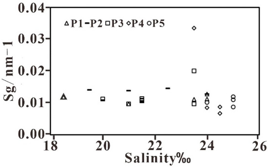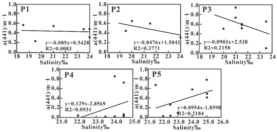 A distinct correlation between salinity and the CDOM absorption coefficient has been suggested especially in coastal waters where land-sourced organic matter is considered as the main source of CDOM [44,45]. The α (441) in the study sea area ranges between 0.0125 m−1 and 0.8544 m−1, with an average value of 0.4874 m−1. This value is consistent with that reported for the eastern channel of Xiamen Bay [46], but is much lower than the value reported for the Pearl River Estuary [47]. In general, Transect P1, P2, and P3 are characterized by relatively high α (441) and low salinity; however, the weak negative correlation between α (441) and salinity is indicative of the complex diffusion procedure of fresh runoff with saline marine water. In addition, α (441) along transect P4 and P5 exhibits great fluctuation (Figure 10). The resuspension of sediment could be the main factor impacting α (441) and its relationship with salinity. In addition, the input of various organic compositions may be another reason inducing the deflection of conservative behavior.
