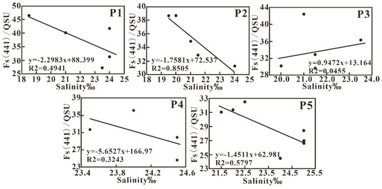 A negative correlation between fluorescence intensity Fs (441) and salinity in the studied sea area is observed (Figure 11), which indicates the mixing behavior of CDOM in water. Further analysis showed that the correlation between Fs (441) and salinity varies between different transects except P3 transect, which shows a weak positive correlation. The extra input of CDOM through resuspension of sediment should be the main factor impacting the relationship between Fs (441) and the salinity of P3 transect. Usually, the fluorescence intensity is more efficient in indicating CDOM with various compositions.