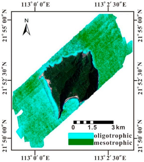 Chl-a is an essential parameter used to indicate a water body’s eutrophication status [48]. The Carlson eutrophic index (TSI) based on Chl-a is calculated as follows: