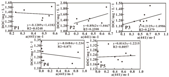 A weak positive correlation between DOC and CDOM is visible in the studied sea area (Figure 15). Further analysis showed that the correlation between DOC and α (441) varies between different transects; in particular, the P2, P3, and P5 showed a weak positive correlation, while the P1 and P4 transects showed a weak negative correlation. The weak and different correlation on different sections indicated that it is difficult to quantify DOC using CDOM absorbance properties.