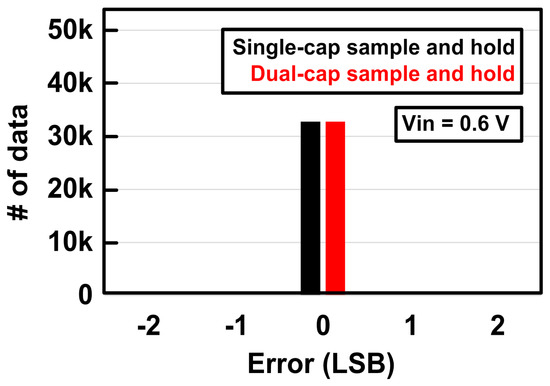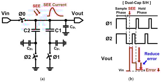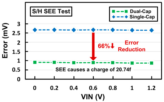 Figure 4b shows the changes of the output voltage when SEE occurs in the proposed dual-capacitor S/H. The charge due to SEE is charged to the parasitic capacitor CPL. When SEE occurs during the hold phase, while the output voltage initially increased by SEE, it lowers primarily because of the C2 capacitor and is then further lowered by the C1 capacitor. As a result, the proposed S/H can be more soft-error tolerant against SEE compared to the conventional S/H. The smaller the size of the parasitic capacitors at the bottom of C1 and C2 capacitors, the larger the effectiveness of the proposed S/H that can be achieved. Considering the typical parasitic capacitance (up to 10–20% of the capacitor) of the sampling capacitors used in ICs, the proposed dual-capacitor S/H still provides an effective solution to sample and maintain the input voltages, suitable for the SAR ADC.