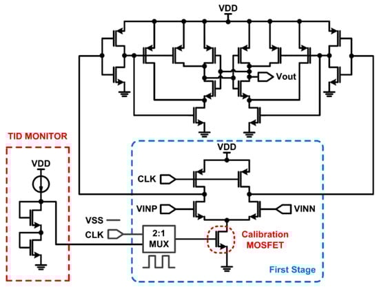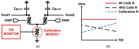 The transient response and operation speed in the Vout1 and Vout2 nodes can be determined by the resistance and capacitance at each output node. When the modeling resistances are changed by TID, the transient responses are also affected, changing the comparator performance. By monitoring the Vth variation of the NMOS transistors and compensating for the resistance value through the calibration NMOS transistor, the comparator can be more robust to TID, maintaining the similar level of operation performance over TID accumulation. Figure 6b shows the concept of the resistance compensation in input transistors of the digital comparator.