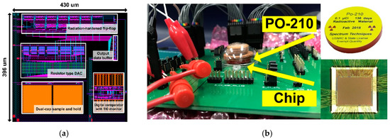 Figure 7a shows the layout floorplan of the proposed SAR ADC, which occupies the total silicon area of 0.17 mm2 (430 μm × 396 μm). The SAR ADC was fabricated in 65 nm CMOS process, and all sub-blocks are closely located to minimize interconnect parasitic effects. A high-energy alpha source (PO-210) was used to verify the soft-error-tolerant performance of the proposed dual-capacitor S/H against SEE. Figure 7b shows the chip radiation test setup with an alpha source, which was located above the test chip. The test chip was directly wire-bonded on the PCB board without packaging because the package of the chip provides a shielding effect when conducting radiation experiments.