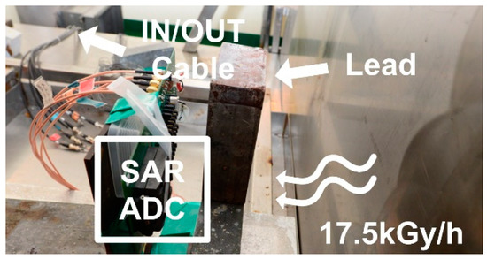 Additional gamma-ray radiation experiments were also conducted in a high-level gamma-ray irradiation facility of the Advanced Radiation Technology Institute (ARTI). Figure 8 shows the chip test setup in ARTI high-level radiation environments with measurement equipment setting beyond the shielding wall of the radiation facility. In order to verify the radiation-hardened performance of the ADC, the remaining parts on the PCB board except the test chip were shielded with lead.
