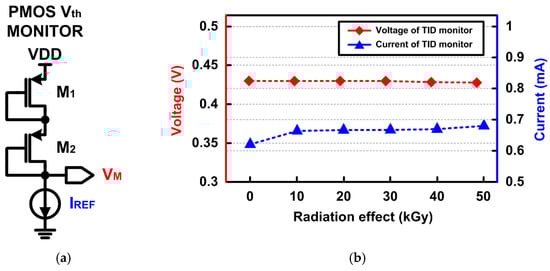 To measure the TID effect, the TID-monitoring circuit of the test chip was exposed to the ARTI high-level radiation environment for 200 min under a high dose rate of 15 kGy/h, resulting in a total ionizing dose of 50 kGy. Figure 9a is a conceptual diagram of the TID-effect monitoring circuit to estimate the TID effect on the transistor threshold voltage, Vth. Figure 9b shows the monitoring voltage, VM, and reference current, IREF, according to the TID level, which describes the change in device characteristics, i.e., Vth. IREF was generated by using the Vth-insensitive current generator in [15]. It can be observed that the monitoring voltage, which can be defined as VM = VDD − VSG1 − VSG2, is near constant around 0.43 V, showing that the TID has a small effect on the transistor, up to 50 kGy.