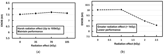 Figure 10a shows the measured effective-number-of-bits (ENOB) of the proposed SAR ADC chip according to the TID levels. The proposed SAR ADC test chip was exposed to the ARTI high-level radiation environments for 6 h under a high dose rate of 17.5 kGy/h, resulting in a total dose of 105 kGy. The proposed SAR ADC maintained its ENOB performance against the high radiation up to 105 kGy thanks to its digital-based architecture in Figure 2, which can be less affected by transistor degradation. The commercial SAR ADC (ADS7044) in Figure 10b suffers from chip performance degradation with radiation effects greater than 1 kGy.