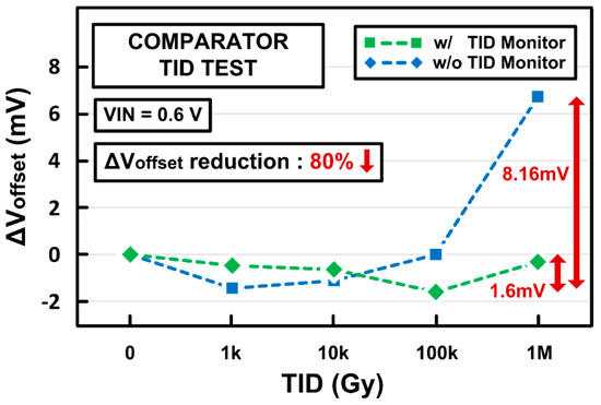 Figure 14 shows the offset voltage variations of the proposed digital comparator against TID effects. The initial offset voltage was set intentionally by using the size mismatch between input transistors. While the digital comparator suffers from large offset variation of 8.16 mV with TID levels up to 1 MGy, the proposed TID monitoring and compensation functions can decrease the offset variation to 1.6 mV, resulting in an 80% reduction. Thus, it can be observed that the digital comparator with TID monitoring can maintain a similar offset performance over a wide range of TID levels up to 1 MGy, leading to robust comparator operation against TID.