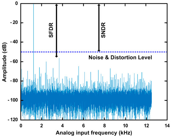 Figure 15 shows the measured 32,768-point FFT spectrum with an input frequency of 1.22 kHz with a 1.2-V supply and a 25 kS/s sampling rate for ADC analysis [18]. The signal-to-noise-distortion-ration (SNDR) and ENOB can be obtained by measuring signal and noise amplitudes. Table 1 summarized the measured performance of the test chip. The measured SNDR and ENOB of the SAR ADC using dual-cap S/H are 49.99 dB and 8.01 bit, respectively. The power consumption of 210 μW roughly results from SAR logic (90 μW), comparator with TID monitoring (90 μW), RDAC (30 μW), and S/H (<1 μW), while buffer amplifiers, references, and I/O buffer inverters are not included. The proposed dual-capacitor S/H improves the soft-error tolerance against SEE, while the SAR ADC performance was not degraded compared to the conventional S/H SAR ADC.