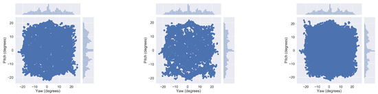 2D gaze angle distributions for train (left), validation (center) and test (right) splits of the Gaze Prediction data subset.