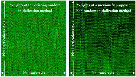 The previously published background work [15] to this paper, also examined repeatable determinism, but in perceptron layers only, and proposed a method, although was tightly coupled to the perceptron layers. That previous paper resolved a numerical stability issue for repeatability and proposed a non-random method for determinism, which achieved an almost equal performance, and it proved the viability of a non-random method without sampling the dataset. That work was furthered in a journal published version [16], which used the Glorot/Xavier limit values, and then achieved an equal performance in accuracy to the random method, now proving equality in performance as an alternative approach. See Figure 1 (left) for the weight matrix as an image of learned weights with the existing random method, and Figure 1 (right) reproduced from the previous work’s [16] non-random number method, both in perceptron layers.