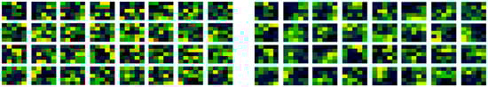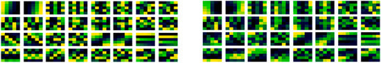 Consistent with Figure 5, convolutional filters examined after learning may be expected to have stripes, spots and perhaps curves, that may be used in edge detection of feature extraction, that will be hierarchically connected and organized to form shapes in later layers. Combined with this, striped and curved patterns may be more conducive in shape detection, that vary from filter to filter and be a less specific specialized mapping in larger filter geometries. In filter generation stripes and curves from a modulation may orientate directions with different selections of width bounding values as they wrap by the maximum width value of the filter, too. Considering the proposed method, in Figure 6 (left) is the proposed non-random method weight filter initialization, again produced for the first convolutional layer. In Figure 6 (right) is those same weights of the filters but after learning has been conducted, as the update to those filters.