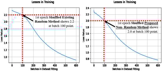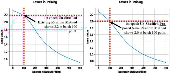 Figure 9 also makes the comparison with the existing random method in Figure 9 (left), and the proposed non-random method in Figure 9 (right). In comparison to the dataset shuffling in Figure 8, and the un-shuffled dataset results in Figure 9, the proposed non-random method has achieved the lower loss quicker in learning in both cases, and is noted at the batch 100 point. Thus earlier learning has benefited relatively in the proposed non-random method, using more of the dataset more effectively from the outset of learning, regardless of the dataset shuffling.