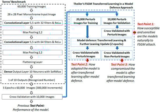 The FSGM transferred learning approach used is by Theiler [36], and it explains the attack with examples, and importantly uses the same MNIST dataset. See Figure 10 for the Theiler and Torres architecture as integrated, with three experiment test points used in this paper’s analysis.