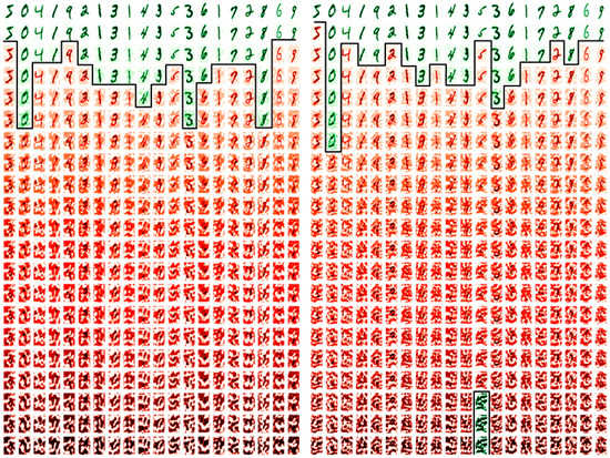 In Figure 11 (left and right) are the first 20 images of the FSGM perturbation attack datasets. They are generated from the sign of the gradient of the loss of a true prediction and an image, In Figure 11 (left) is the generation from the existing random form, and in Figure 11 (right) from the proposed non-random method instead. Along the column’s axis are the first 20 images of each dataset, and in each row, as perturbed with images with an increasing epsilon value of 0.0 to 1.0 in steps of 0.05. In green are the perturbation images that are correctly classified against their original tag, and in red are the perturbation images that are miss-classified.