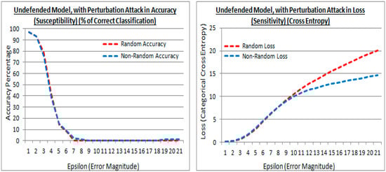 Figure 11 shows that the low perturbation epsilon error values images (at the first rows) are humanly recognizable and the high epsilon error values images (at the last rows) are not humanly recognizable. At the point that the miss-classifications occur, the strength of the competing image’s pixels becomes more apparent, and traditional de-noising and image value clipping would enhance the image classification in many cases of both methods. The subject of noise and noise injection, but as a method for defense from FSGM is proposed in 2020 by Schwinn et al. [37], but their approach requires a learning regularization step that couples it to the dataset. Although the Schwinn et al. [37] approach is of interest, in a non-dataset coupled form, and perhaps as an augmentation to the epoch scheme. However, this paper’s approach is purely to examine the transferred learning compromise with a reduction in noise re-colorization opportunities. Thus applying the same perturbed FSGM attack method with different epsilon error strengths, a comparison in accuracy and loss between the existing (random) and proposed (non-random) methods are presented in Figure 12, Figure 13 and Figure 14.