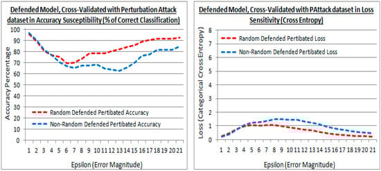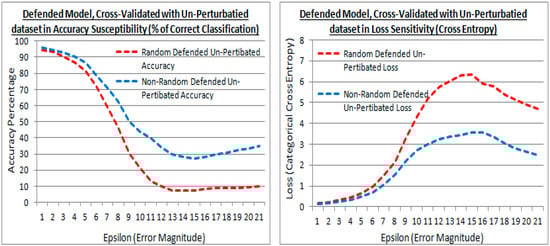 Figure 14 shows the defended model with the original dataset cross-validation in accuracy and loss. It also shows that at greater epsilon error magnitudes the difference between the existing (random) and proposed (non-random) methods are divergent. The proposed (non-random) method being the higher accuracy in Figure 14 (left) and lower loss in Figure 14 (right). Meaning that the proposed (non-random) method has suffered less when re-trained with the perturbed dataset to defend it, i.e., the transferred learning has less affected the accuracy to the original dataset, most notably with larger distortions (i.e., a numerically dissimilar dataset). Thus the proposed method has retained more of the original learning from the dataset that was transferred.