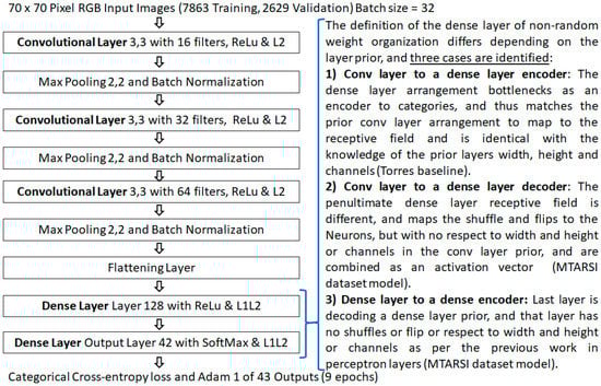 Note that the weight calculation algorithm of the dense layer is dependent on the layers prior, and as such the dense layer weight calculation algorithm may vary depending on the architecture. This is because the activations could be the number of neurons of a proceeding dense layer, and in that case, the subsequent shuffle reordering and flips may not be necessary as the layers are fully connected as in the papers [15,16]. However, if there is a proceeding convolutional layer, then the activations map to the receptive fields of the convolved image filters, which is the case in this benchmark model. So in this case the height and width are the image size and the depth is inherited as the channel depth (or filters from the previous layer), as in Equation (12), and the value set of cnt is in Equation (13).