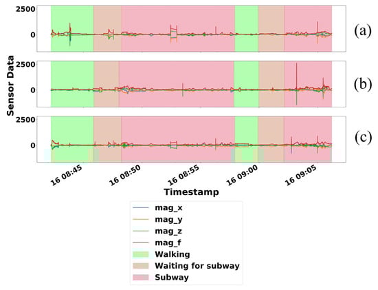We used a dataset collected by Kosasih et al. [] in Busan, South Korea. The sensor readings were generated from three devices: Samsung Galaxy S6, Samsung Galaxy tab S5e, and Samsung Galaxy S6 edge. This dataset provided a total of three magnetometer signals; these signals are as follows: