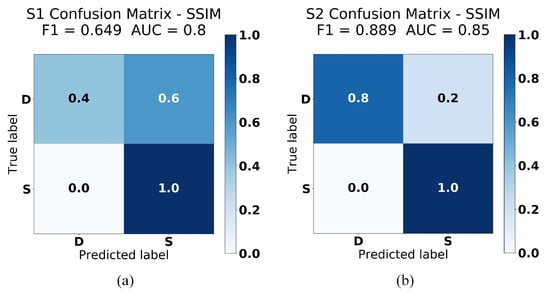 Confusion Matrices of SSIM analysis experiment (without filling up the area under the line) on (a) test data 1: Samsung Galaxy tab S5e (b) test data 2: Samsung Galaxy S6.