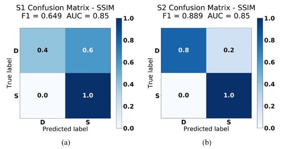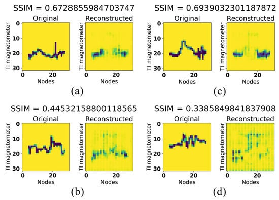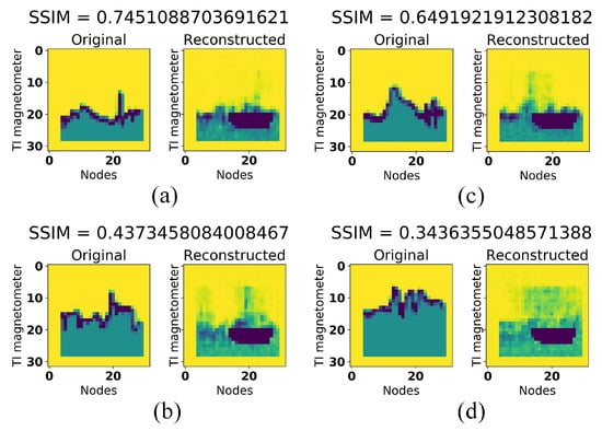 We also display some reconstruction results of this experiment as can be seen in Figure 10. Figure 10a,b are reconstruction results from the first test data whereas Figure 10c,d are reconstruction results from the second test data. Test data in Figure 10a,c were collected from the same location with the training data while Figure 10b,d were collected from different locations. These results indicate that fixing SSIM index to 0.5 would give us best classification performance.