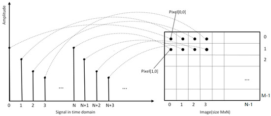 Figure 1 provides a visual explanation of the transformation. In the graph, the number of samples contained in the vibration signal is M × N, where M × N represents the size of the image (M and N values are the rows and columns of the image, respectively). The values of M and N depend on the length of the vibration signal. The computational complexity of the method is directly proportional to these values. Therefore, M and N values should be selected to be as small as possible to reduce complexity; however, it should also be ensured that these values are sufficiently large to retain the most important features of the original. The values suggested by Chong [20] for M and N are: M = 128, 256, or 512, and N = 128, 256, or 512. The conversion process of the time-domain 2D image is clearly shown in Figure 1.