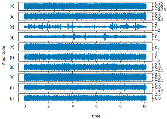 Figure 12 shows the time-domain diagram of the original vibration signals of MFPT under different health conditions. A total of 35,473 samples were obtained from the original MFPT dataset, of which 16,833 samples were randomly allocated for training, 3535 samples for verification, and 2681 samples for testing. A detailed description of the dataset is shown in Table 7.