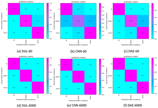 Confusion matrix on testing samples of the MFPT dataset: (a) SSJL-60, (b) CNN-60, (c) DAE-60, (d) SSJL-6000, (e) CNN-6000, and (f) DAE-6000.