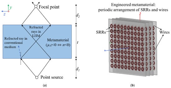 The negative square root in the calculation of n is chosen in (4) when both μ e f f ( ω ) and ϵ e f f ( ω ) are negative to account for propagation of left-handed waves in a metamaterial []. A left-handed transmission band occurs within the previously overlapping forbidden bands of negative μ e f f and negative ϵ e f f . The combined array behaves as a medium having an effective negative refractive index in this transmission band, and the transmission peak is referred to as a left-handed peak. Such a negative index medium not only focuses propagating waves but also enhances the evanescent wave component of the angular spectrum of the incident field, which contains high-resolution information. Subwavelength focusing beyond the diffraction limit is, thus, made possible by using a negative index metamaterial lens. As shown in Figure 1a, for an ideal lossless LHM lens of thickness t and refractive index n = −1, a diverging beam from a point source at a distance d1 from the lens focuses first inside the lens and, then, outside the lens at a distance d2 given by []