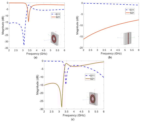 Figure 3. HFSS S-parameter results for (a) SRR-only medium, (b) wire-only medium, and (c) SRR and wire combined metamaterial medium. The respective HFSS models are shown in the insets of the figures.
