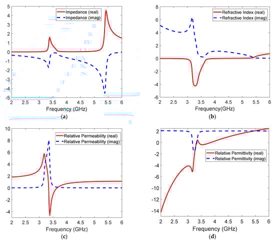 Figure 4. Extracted simulated EM parameters of the metamaterial design: (a) impedance, (b) refractive index, (c) permeability, and (d) permittivity.