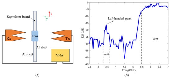 A large metallic screen (~10λ) with an aperture was used to obtain the transmission characteristics of the fabricated metamaterial lens. The metallic screen was implemented by attaching aluminum sheets to a Styrofoam board. An aperture of the size of the lens was cut in the middle of the board to allow for waves to pass through the lens only []. Wideband (675 MHz to 12 GHz) Vivaldi antennas were used as transmitter and receiver to illuminate the lens with a uniform plane wave. The antennas were placed 40 cm apart to ensure far-field measurements. The frequency sweep measurements were done using an Agilent EB070B vector network analyzer (VNA). Figure 6a shows the schematic of experimental set up. The measurements of S21 clearly indicate the presence of a left-handed transmission band with a peak transmission of −16 dB around 3.5 GHz (Figure 6b). The slight shift in frequency between the simulated and experimental results can be attributed to fabrication tolerances. Above 5.5 GHz, the metamaterial acts as a conventional medium having positive μ e f f and ϵ e f f . Conventional right handed waves are allowed to propagate in this frequency regime, and hence, the transmission band is observed.