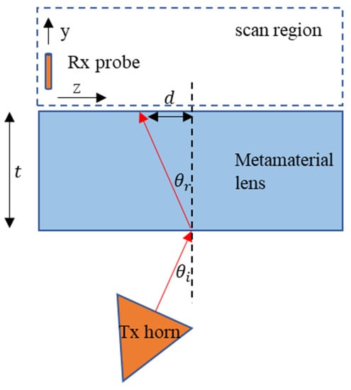 An imaging experiment was carried out to demonstrate negative refraction by the metamaterial lens and calculate its effective refractive index []. A standard gain horn antenna at 3.5 GHz was used as the transmitter, while a quarter wavelength monopole was used as the receiving probe. Outgoing spherical waves from the horn are incident at an angle θ i at the first air-LHM interface. After undergoing negative refraction through the LHM of thickness t, the waves are shifted towards the side of the transmitter by a distance d at the second LHM–air interface. The angle of refraction can be determined by scanning the received signal amplitude can be calculated as θ r = tan 1 ( d / t ) . The top view of the experimental setup is shown schematically in Figure 8.