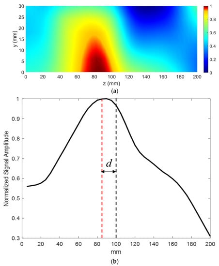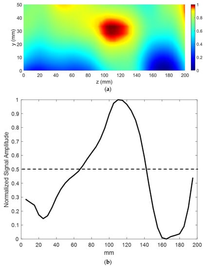 Figure 11. (a) Normalized received signal amplitude. A focal spot is observed at a distance of d2 = 30 mm from the lens. (b) Normalized line scan at y = 30 mm. The dashed lines indicate −3 dB point.