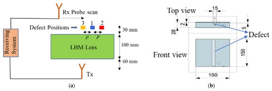 Next, the capability of the LHM lens for detection of subwavelength defects with far-field microwave NDE data is demonstrated. The experimental setup is shown in Figure 12, and the schematic top view is shown in Figure 13a. Figure 13b shows the schematic of the sample under test. Teflon samples are used as the dielectrics for testing. A groove of size 15 mm (0.17λ) × 5 mm (0.06λ) is machined along the length of the sample. A similar Teflon sample with no machined groove is treated as the healthy sample. The samples are placed at the focal spot of the lens, and line scans are performed to obtain the scattered data. The contribution due to the defect is measured by the changes in the test signal relative to the baseline signal (found by measuring the healthy sample). The calibration and detection procedure is shown in Figure 14. The position of the defect can be determined by the minima in the line scans []. Three sets of measurements were taken at three positions of the sample. The distance p between consecutive defect positions was set to be 20 mm (0.23λ).