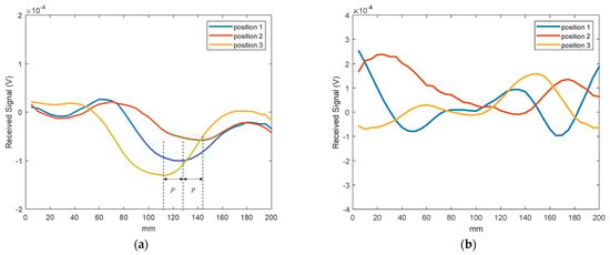 Figure 15. NDE line scan results. (a) Measurements using the LHM lens. The minimum of the plot gives the defect position. (b) Measurements without the LHM lens. Waves are not focused in free space. Subwavelength defects position cannot be determined.