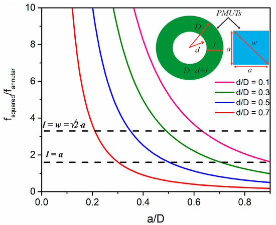 Theoretical frequency ratio, fs/fa, from two single elements of an annular array and a multielement multiring array with the same area according to Equation (4). Inset: Only one annular ring and one single square PMUT from the annular and multielement ring arrays are shown.