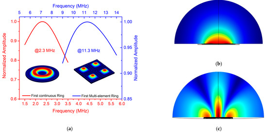 FEM COMSOL dynamic simulation in liquid for the first continuous ring and the first multielement ring: (a) frequency response where left-bottom (red curve) corresponds to continuous ring and right-top (blue curve) corresponds to multielement ring; (b) continuous ring pressure map at 2.3 MHz; (c) multielement ring pressure map at 11.3 MHz.