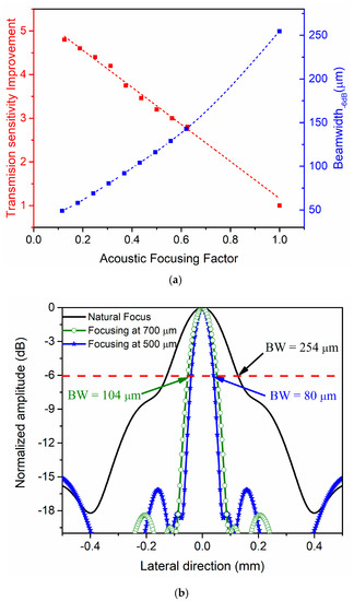 Field II simulations: (a) dependence of the transmission sensitivity improving factor (red curve) and the beamwidth (blue curve) on the acoustic focusing factor; (b) cross-section in lateral direction at two different focal points (500 and 700 µm, corresponding to acoustic focusing factors of 0.3 and 0.44, respectively).