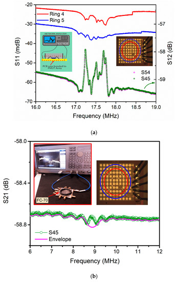 Then, the expected resonance frequency in liquid will be approximately half the air resonance frequency, i.e., 9.4 MHz (fair/√(1 + β)). Figure 6b shows the electrical frequency response of the crosstalk between ring #5 and ring #4 in FC-70. The resonance peaks appear between 8 and 10 MHz, being in correspondence with the expected value (9.4 MHz). On the other hand, in liquid, the high acoustic radiation damping is translated into a low quality factor and consequently to higher fractional bandwidth, hence lowering the S21 magnitude at resonance and smoothing the single-element frequency peaks of the same ring.
