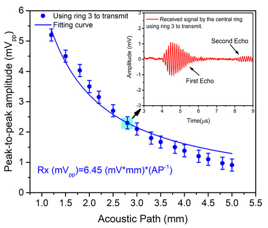 Figure 9 shows the measured echo voltage and its dependence on the acoustic path using ring #3 (blue points) (same measurements were also acquired for ring #4 and ring #5). Taking the fitting results, the receiving sensitivity (SR) can be computed as Rx/Pt (where Pt is defined by the normalized pressure, NP/z, in Table 4), giving an average value of 441.6 nV/Pa ((Rxcentral/Pt3 + Rxcentral/Pt4 + Rxcentral/Pt5)/3). This receiving sensitivity is affected by the parasitic capacitances between the PMUT and voltage amplifier (PCB, connectors, cables, etc.) according to Equation (9) [32]:
