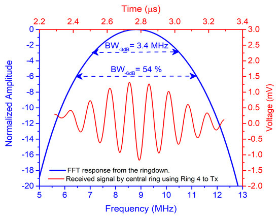 The time-domain response shown as the red curve in Figure 10 corresponds to pulse-echo measurement when ring #4 is used to transmit and the central ring is used to receive. The time-of-flight of the received echo is 2.34 μs, which gives an FC-70 thickness of 800 µm (FC70thickness = ToF × c/2). Taking the ringdown, the fast Fourier transform was computed (see Figure 10, blue curve), giving a resonance frequency (f0) of 8.8 MHz with fractional bandwidth at −6 dB close to 54%.