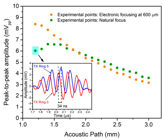 For electronic focusing or phased-array rings, 34 ns was applied to ring #3 during transmission to allow both acoustic waves to arrive in phase, achieving a maximum acoustic pressure at 0.6 mm (see Figure 12, orange points). Computing the focusing improvement factor as the ratio between maximum received echoes (8.4 mVpp/6.59 mVpp), a 1.3× improvement factor is obtained, which is translated into an acoustic pressure of 19.4 kPapp (1.3 × 14.9 kPapp).