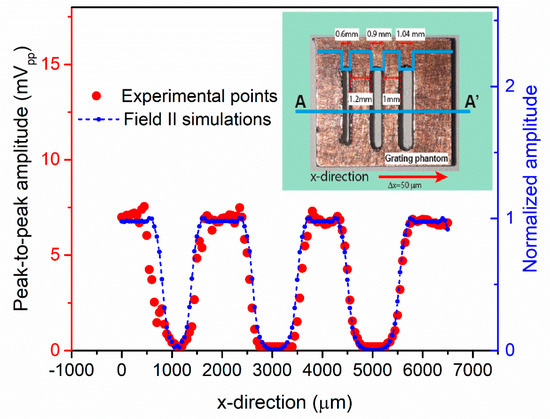 Pulse-echo ultrasonic 1D image of a grating phantom. Red curve: experimental points; blue curve: Field II simulations. Inset: Grating phantom with A-A’ scanned profile.