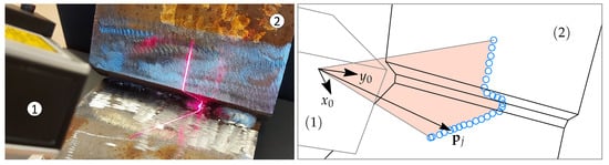 When weld grooves in large tubular joints are scanned and parametrized, two main joint types should be taken into consideration. These are butt joints with a typical V-groove and stub joints (or T-joints) with an asymmetric weld groove with one side being curved (due to the pipe geometry) []. The online weld seam tracking technique was proposed and tested for large tubular joints in [], where the pipes were interfaced and welded with a fillet weld (i.e., without a pre-machined weld groove). A similar work for the intersection between a pipe and a sphere was presented in [], where the problem of curved groove sides was discussed. In the case of multi-pass welding, the groove around the whole joint should be first scanned and parametrized offline before the welding can start. This is due to non-uniform welding grooves with a varying number of beads required in each scanned groove section [,,].