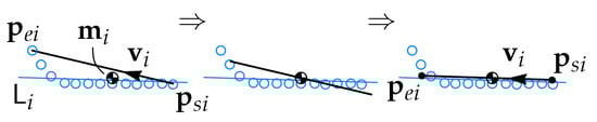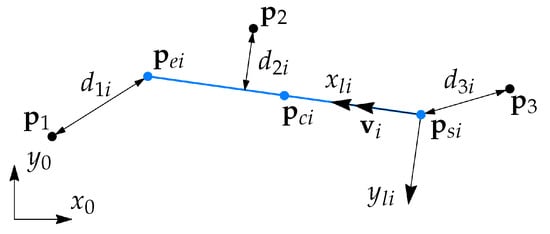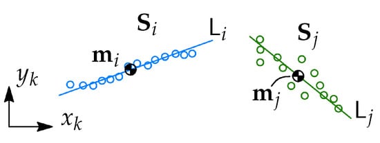 The main object used in the RANSAC search (presented in Section 3.2) is a 2-dimensional (2D) line segment. A line segment i (see Figure 4) is defined by the start point and the end point , while the center point is defined as .