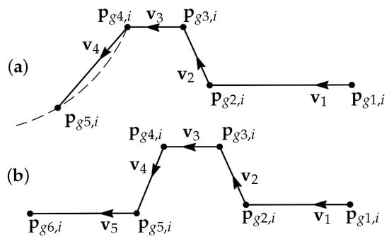If the angle is outside the tolerance , then the point of intersection between segments i and , , is found and the start point of i is reset as , see Figure 9.