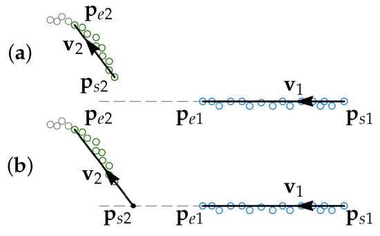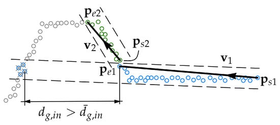 The direction vector of every newly found segment i is compared to the direction vector of segment . Segments i and are merged if the angle between the direction vectors is small (i.e., within the defined tolerance ). This is demonstrated for segments 1 and 2 in Figure 8.