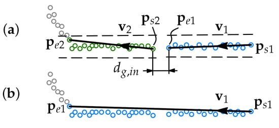 The segment is then defined by the first and the last points in the inlier set, where the inliers after the first detected gap along the axis (see Figure 5) larger than the gap tolerance are not included in the segment definition. Then, the next point after is assigned to be , all inliers of segment 1 are removed from the dataset, and the RANSAC search is done for segment 2. This loop is repeated until the condition for the minimum number of remaining points in the dataset is met.