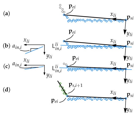 First, the line segment i is found (Figure 10a). Then the inlier coordinates are converted to the local coordinate system of the segment, the coordinates of the points are normalized along the x axis, and a line model fit is found (Figure 10b). If a corner of the next element is assigned, then the absolute value of the first-order coefficient of the line model is . Then the inliers are removed from the end of the array until the acceptable limit of is reached (Figure 10c). In the final step, the line segment is reformulated using the newly defined last assigned point (Figure 10d), and the RANSAC search of the next line segment starts.